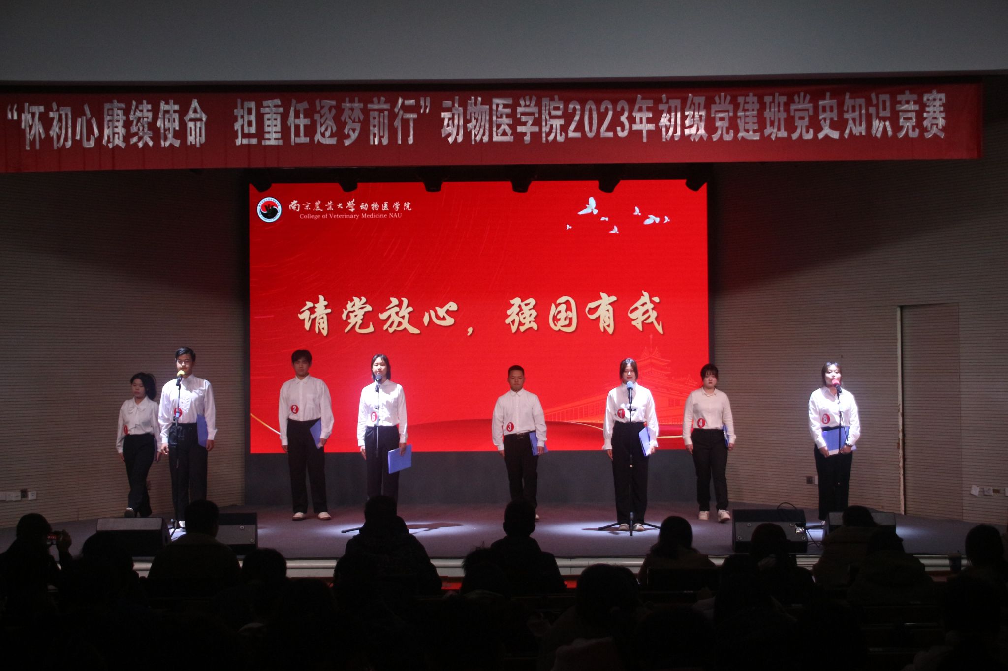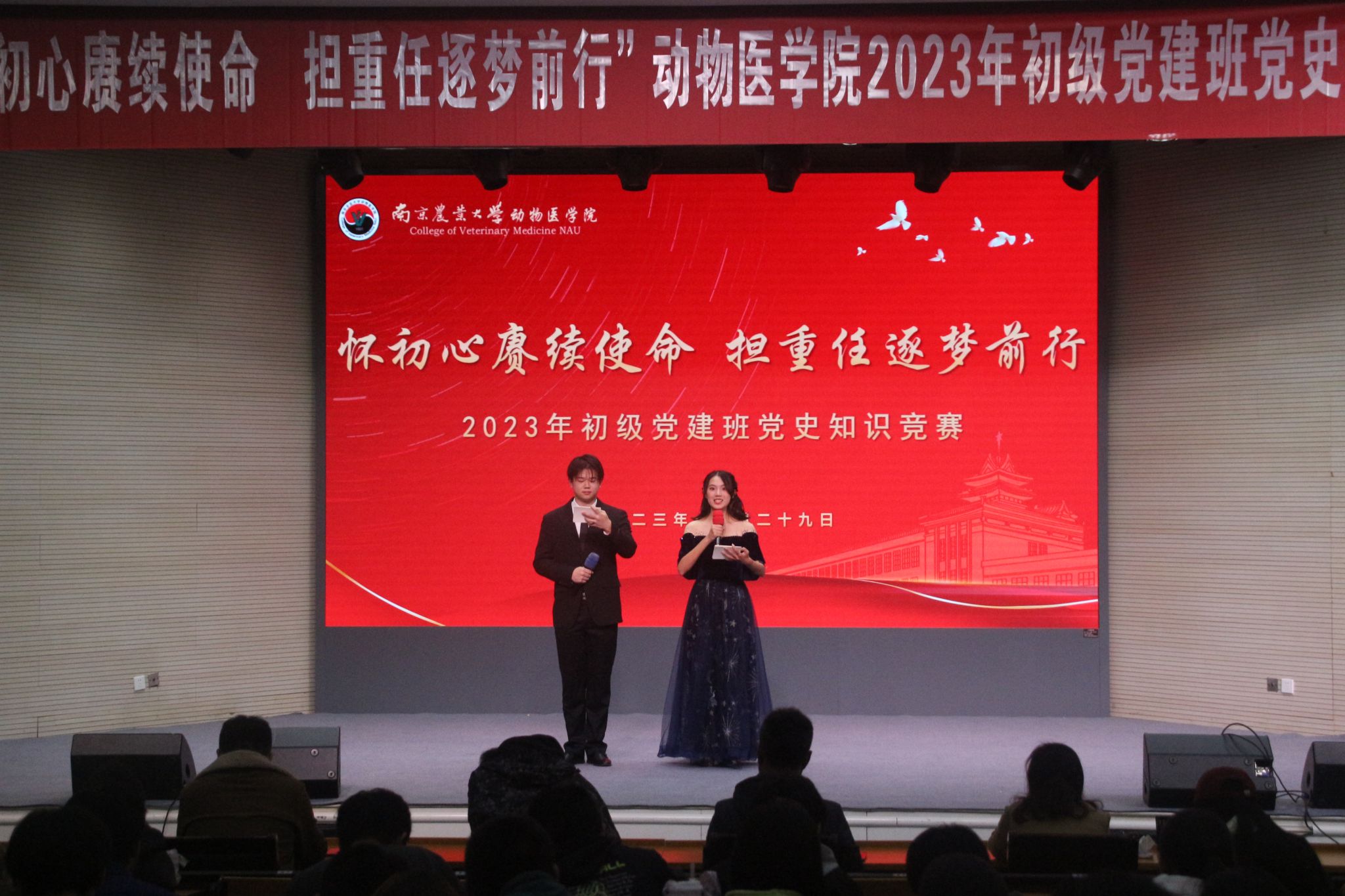 11月29日晚,新葡萄8883官网AMG“怀初心赓续使命,担重任逐梦前行”2023年初级党建班党史知识竞赛于大学生活动中心报告厅举行。新葡萄8883官网AMG党委副书记李云锋老师,南京农业大学党委组织部党校办公室主任徐晓丽老师、组织员(科级正职)何旭老师,学院辅导员金洁南、徐刚、李欣欣、安琪、田文秀担任本次活动评委,学院2023年初级党建班全体成员及新葡萄8883官网AMG全体大一新生及各年级发展对象、预备党员参与了本次活动。