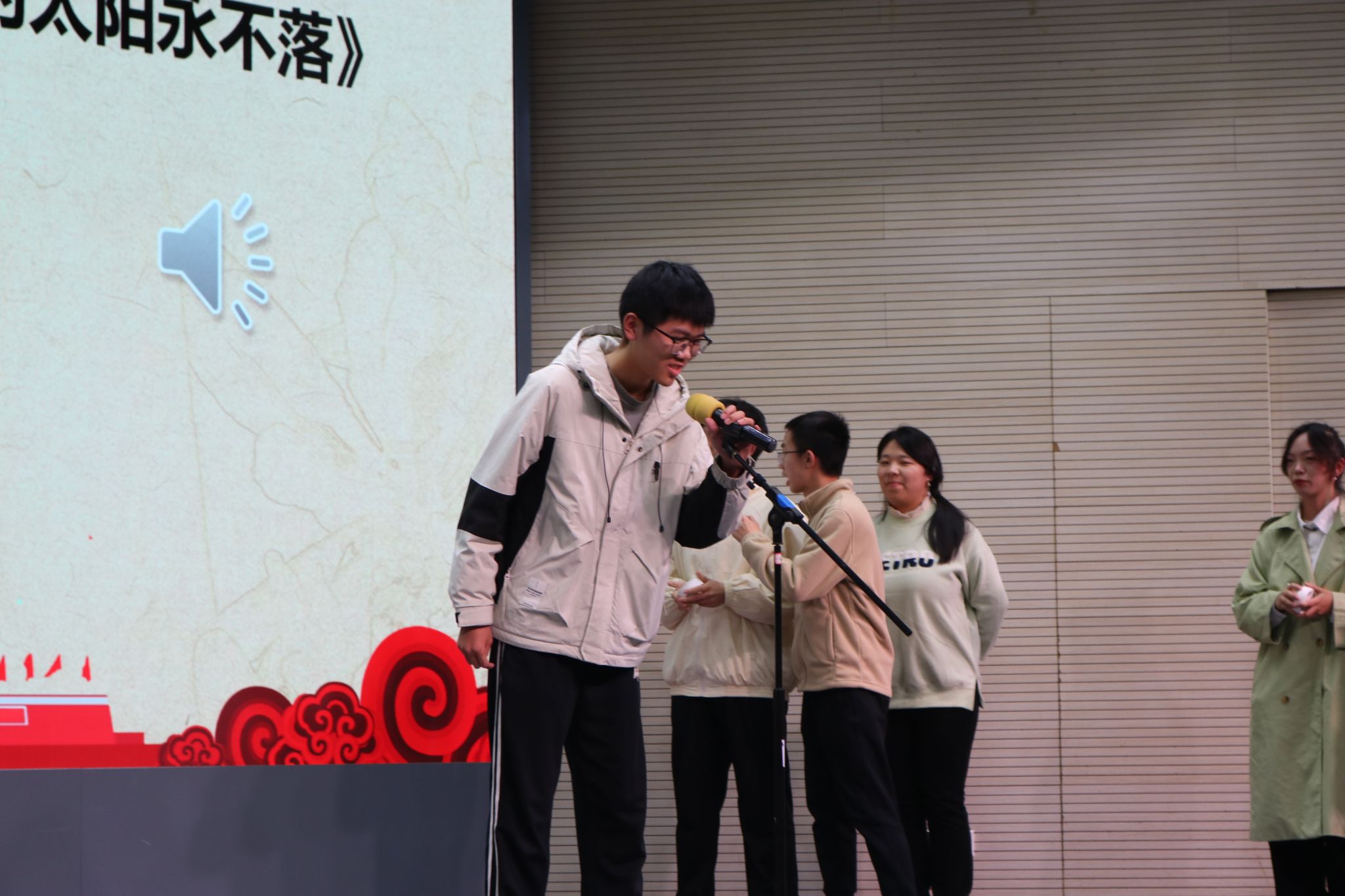 在“以我之声,颂百年强音”环节,八个班级分两批走上舞台,抢答接唱红色歌曲。选手们的热情高涨,使得这个环节活力十足,充满趣味。