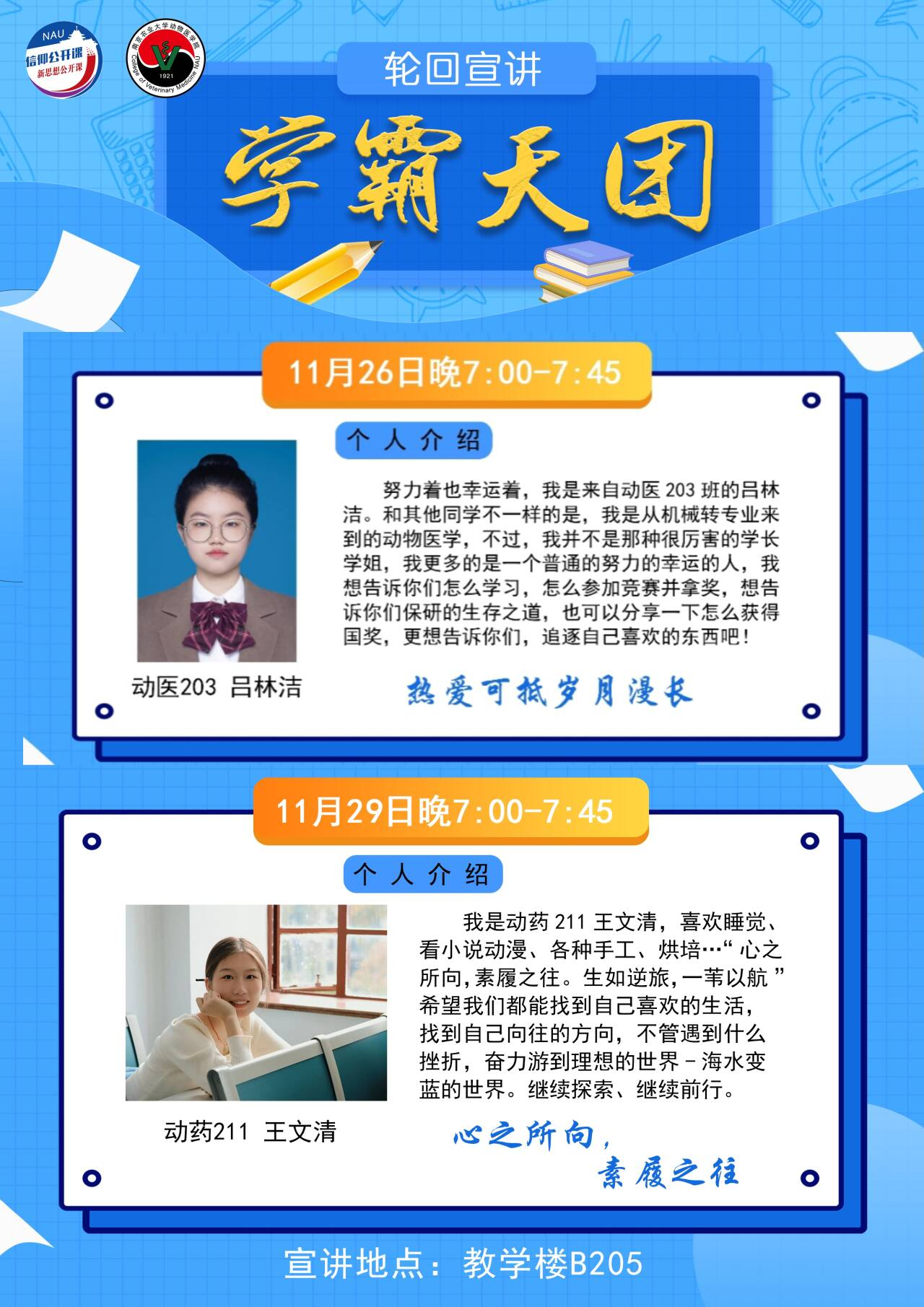 2023年11月26日与11月29日,新葡萄8883官网AMG“学霸天团”轮回宣讲活动第四期成功举办。本次活动邀请动医203吕林洁、动药211王文清两位同学,为22、23级动医学子分享自己的学习经验。