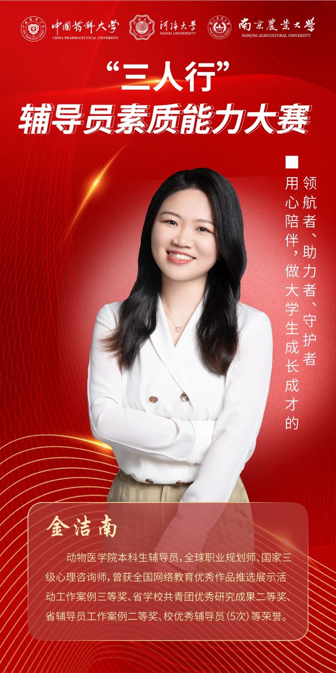 12月7日,由中国药科大学、河海大学、南京农业大学共同主办的“三人行”辅导员素质能力大赛如期举行。来自3所高校的12名辅导员经过各自校赛的激烈角逐,脱颖而出进入此次三校联赛。决赛主要包括案例分析和谈心谈话两个环节。经过两个环节的激烈角逐,我院辅导员李欣欣喜获特等奖,辅导员金洁南喜获一等奖!