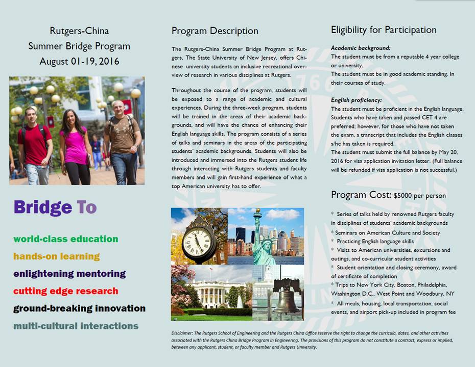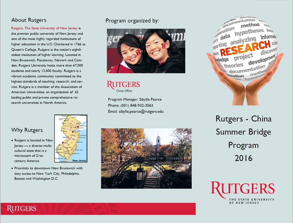 为开阔广大学生的国际视野,增进对美国社会、经济、文化的了解,促进校际友好交流,我校将组织学生于2016年暑期赴美国罗格斯大学参加暑期学校活动(Rutgers University – China Bridge Program Summer 2016)。现将此次报名事项通知如下: