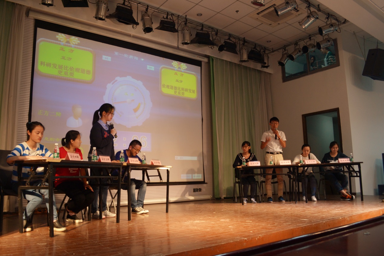 本次辩论流程:开篇立论、攻辩、攻辩小结、自由辩论、总结陈词,比赛中双方各从多方立论。攻辩环节反方多次援引举例,攻击正方,而对于正方的反问始终冷静应答。到了最后自由辩论,双方就科学创新与其引发的伦理道德问题的关系将辩论推向高潮。本次辩论在常规辩论流程后增加了观众互动环节,在场同学积极发言,为比赛增添别样色彩。