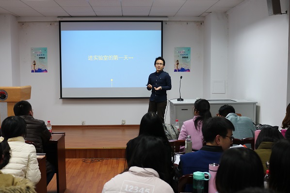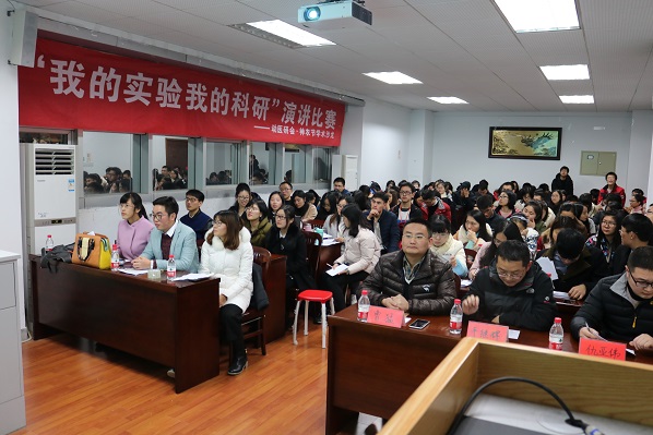 比赛在现场观众们的热烈掌声中拉开帷幕。参赛选手们精神饱满、声情并茂,从自己的研究生学习、经历和感受等不同角度向大家展现了自己对于科研生活的看法。其中二号选手刘杰的演讲《我的实验室,我的家》,用自己从考研起到进入研究生科研生活的亲身经历,讲述了科研的辛苦与快乐。四号选手王胜男以《生活不止眼前的实验,还有诗和远方》为题,从另一个角度讲述了她对科研的看法。她通过新闻和小视频等向大家阐述了久坐和熬夜的危害,她表示合理地安排时间和实验才是正确的科研之道,身体是革命的本钱。七号选手李佳容别开生面,作了题为《关于你的那些抱怨》的精彩演讲,讲了实验室关于“吐槽”的普遍现象,并表示可以找一个好友一起开启吐槽模式。八号选手唐芳玲演讲的题目是《命中注定,我得遇见你》,声情并茂地讲述了考研复试选导师的心路历程,以及导师给她上的一堂心理辅导课让她真正明白读研的意义,极具感染力的精彩演讲打动了评委和在场的观众。最后,平继辉教授与同学们分享他的国外科研经历。