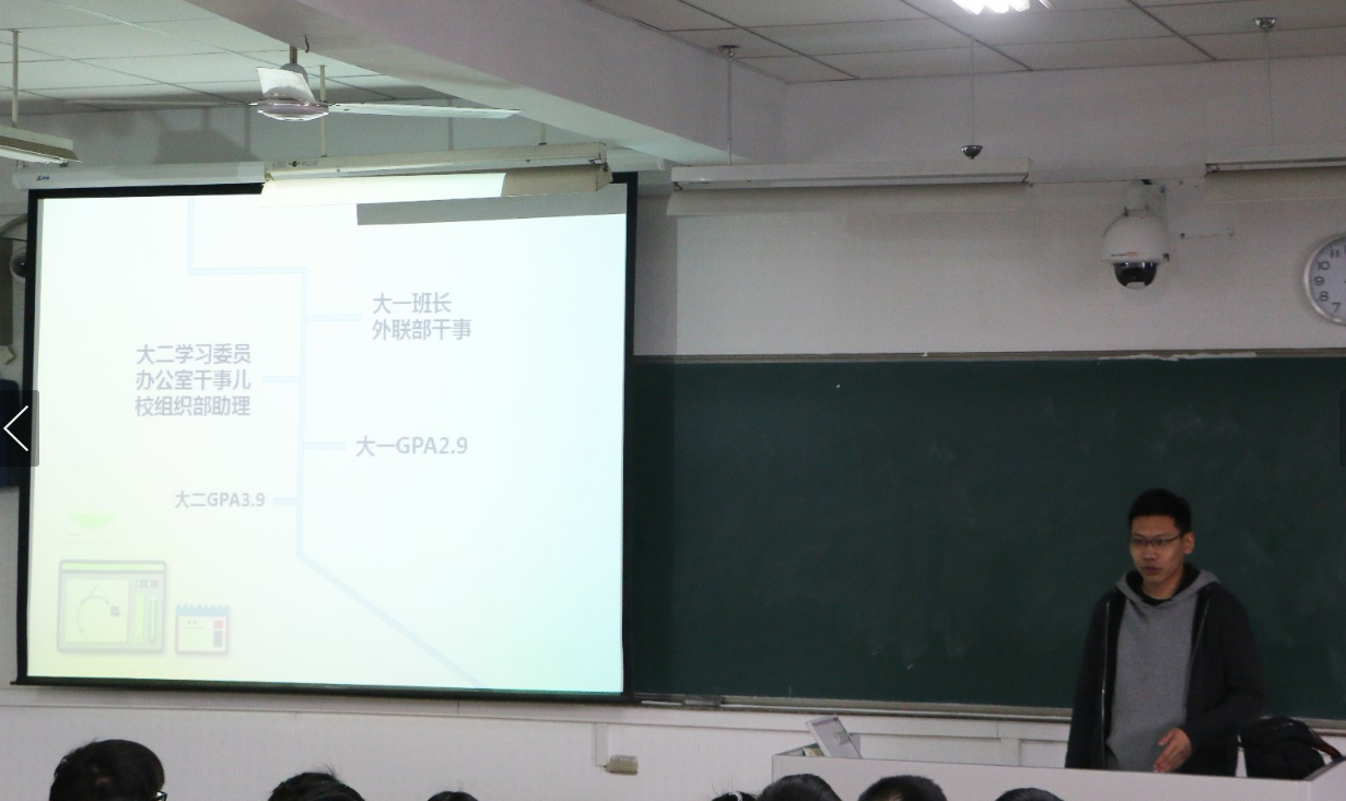 活动伊始,金洁南针对16级第一学期成绩进行了分析和概括,肯定16级学生的勤奋和努力,并结合学生手册,对第二课堂成绩单、综合测评、奖学金评定等方面做了简单阐述。