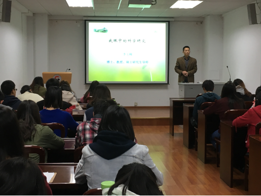 首场报告为李玉峰教授的“我眼中的科学研究”。他指出所谓科学研究,就是观察科研现象,进行科学实验,开展科学讨论,其中科学实验的意义,就是促进人类社会进步和解决实践问题。他讲述了科学研究的特性,包括计划性、系统性、创新性等,而做好科学研究需要正确的科研态度,良好的科研心境,正确的科研方法和永不言弃的科研精神。李老师着重强调了包容的学术思想和与人为善的生活方式。