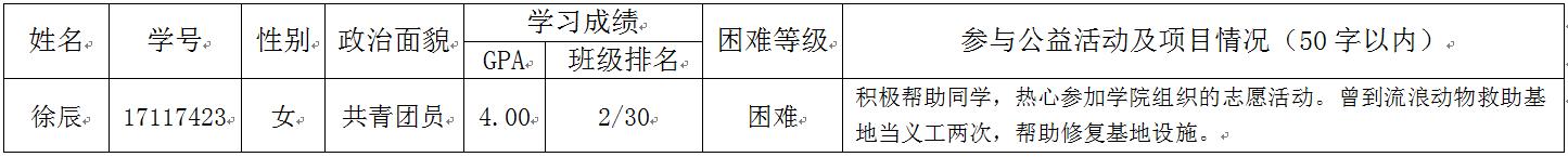 为鼓励先进,进一步推动我院资助工作有效开展,根据学校唐仲英德育奖学金评选相关规定,优先考虑家庭经济困难、学习成绩优异的学生,通过前期学生自主报名、学院审核评审,拟推荐 徐辰 参加学校评选,具体情况如下: