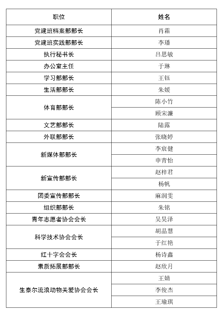 根据《关于学院第三十五届党建班、团委、学生会部长换届通知》,本着公平公正公开的原则,在经过推荐自荐、考核面试、综合考量之后,现将第三十五届新葡萄8883官网AMG党建班、团委、学生会部长名单公示如下: