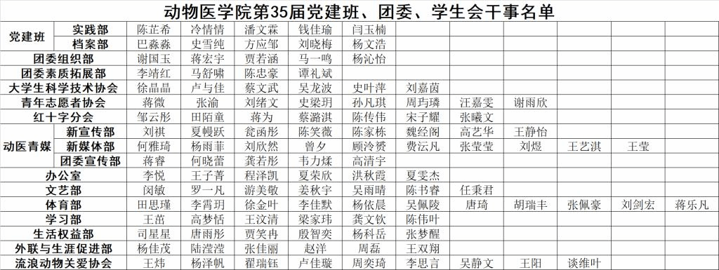 根据《关于学院第三十五届党建班、团委、学生会干事换届通知》,并结合第三十五届党建班、团委、学生会各部门的实际情况,本着公平公正公开的原则,在经过个人申请、考核面试、综合考量之后,现将第三十五届新葡萄8883官网AMG党建班、团委、学生会干事名单公示如下: