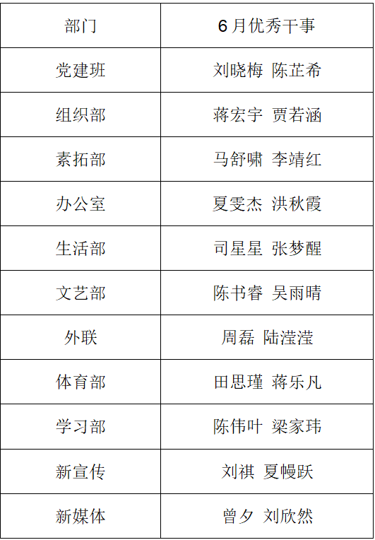 【学生工作】第35届党建班、团委学生会各部门6月优秀干事名单公示