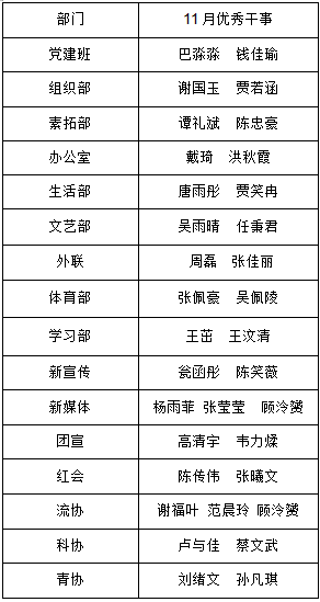 【学生工作】第36届党建班、团委学生会各部门11月优秀干事名单公示