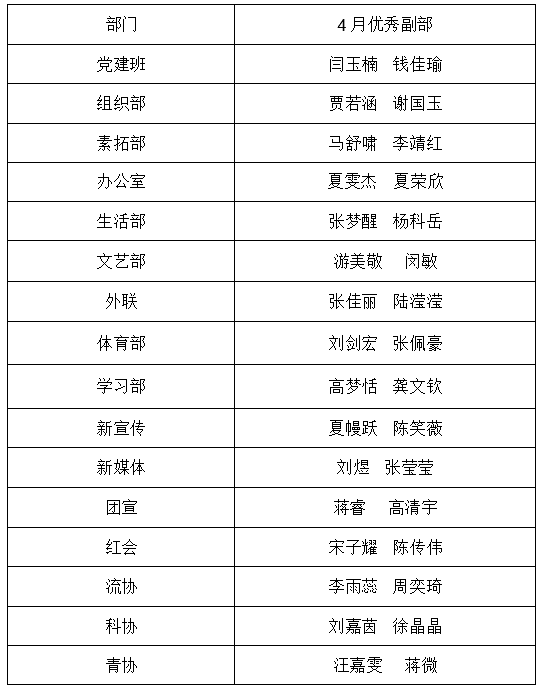 【学生工作】第36届党建班、团委学生会各部门4月优秀副部名单公示