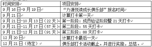 第一阶段(21天打卡):请加入俱乐部的成员,需要完成21天的阅读打卡,每天需要至少阅读30分钟,打卡的具体操作建议为:每人每天阅读之后需要在“力源悦读成长俱乐部”的QQ大群中和自己小组的QQ群中,发表100字左右的“阅读进展及读书心得”(当天晚上22:00前),供大家交流讨论。如因特殊情况需中断(不超过1天)的成员,需上报组长,并经过俱乐部部长同意。本阶段有1天“懈怠时间”。累计2天及以上中断,则需从第1天重新计算,阅读打卡操作参照第一阶段打卡。