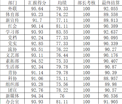 备注:此得分由中期汇报得分,部长考核得分和部门均绩按4:3:3比例得出。其中汇报得分由评委老师打分算出平均分、主席团平均分和部长团平均分按照4:3:3得出,部长考核包括会议出勤,值班签到等和主席团辅导员额外扣分,部门均绩按均绩*100/4.5折算。