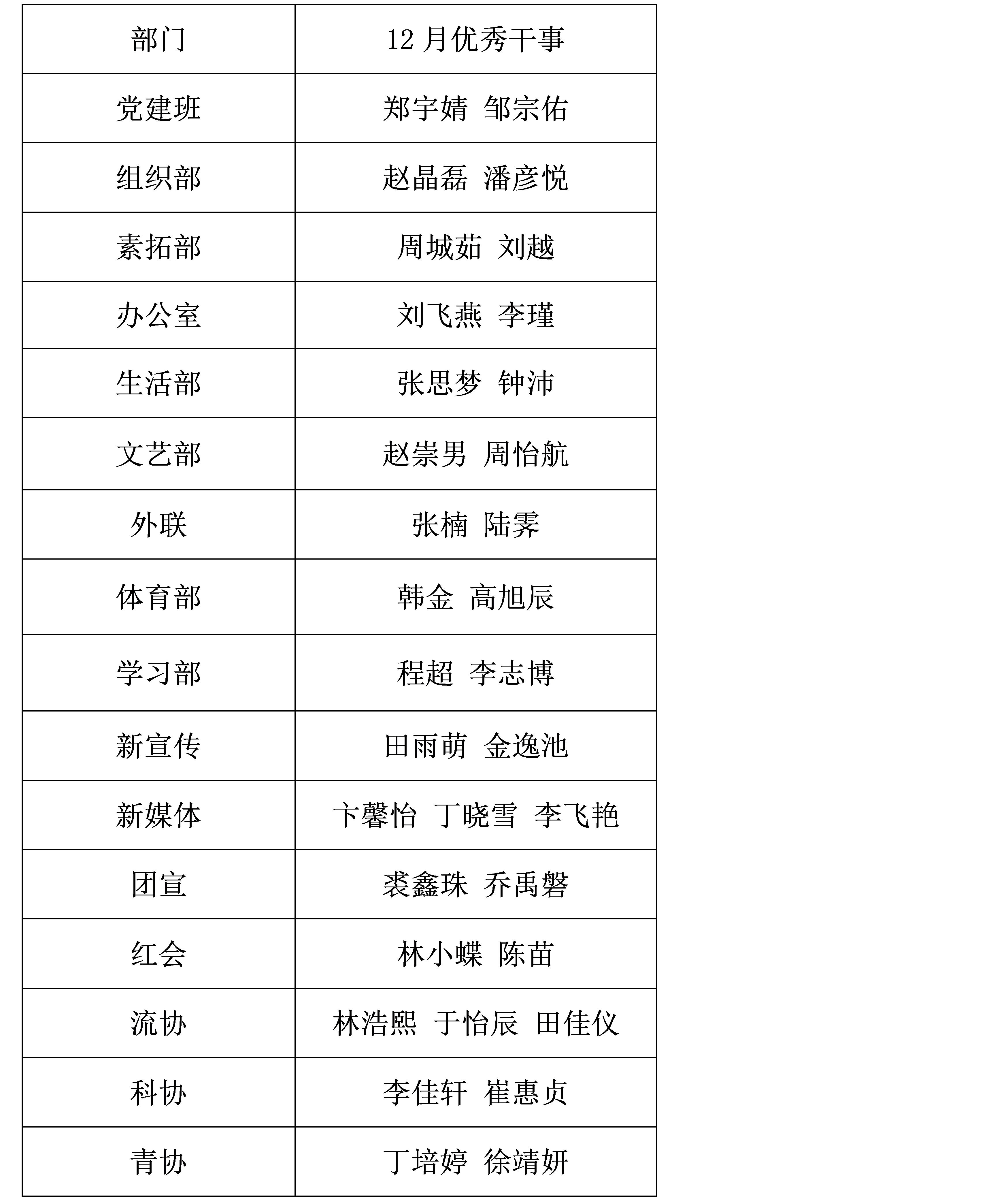 【学生工作】第37届党建班、团委学生会各部门12月优秀干事名单公示