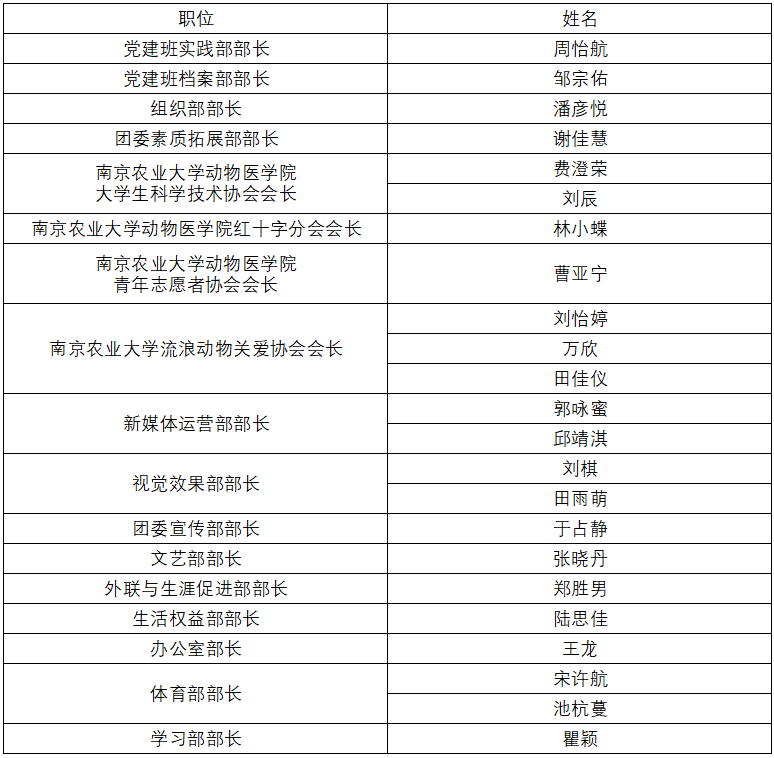 根据《关于学院第三十八届党建班、团委、学生会及动医青年传媒中心部长换届通知》,本着公平公正公开的原则,在经过推荐自荐、考核面试、综合考量之后,现将新葡萄8883官网AMG第三十八届党建班、团委、学生会及动医青年传媒中心部长名单公示如下: