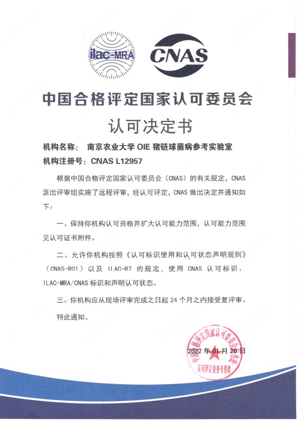 南京农业大学OIE猪链球菌病参考实验室通过CNAS复评审与扩项认可